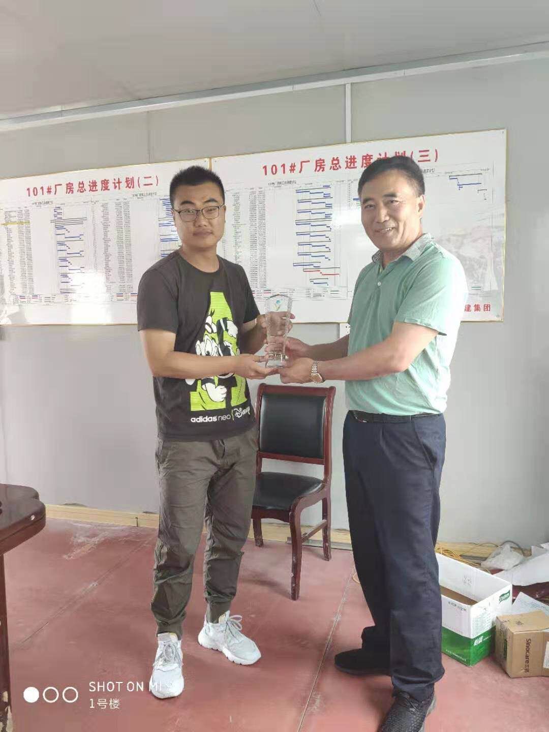 揚建網訊 6月16日,開發區投資服務局局長翟學義代表開發區管委會向我集團TPI風機葉片生產廠房項目部贈送了錦旗和獎杯。