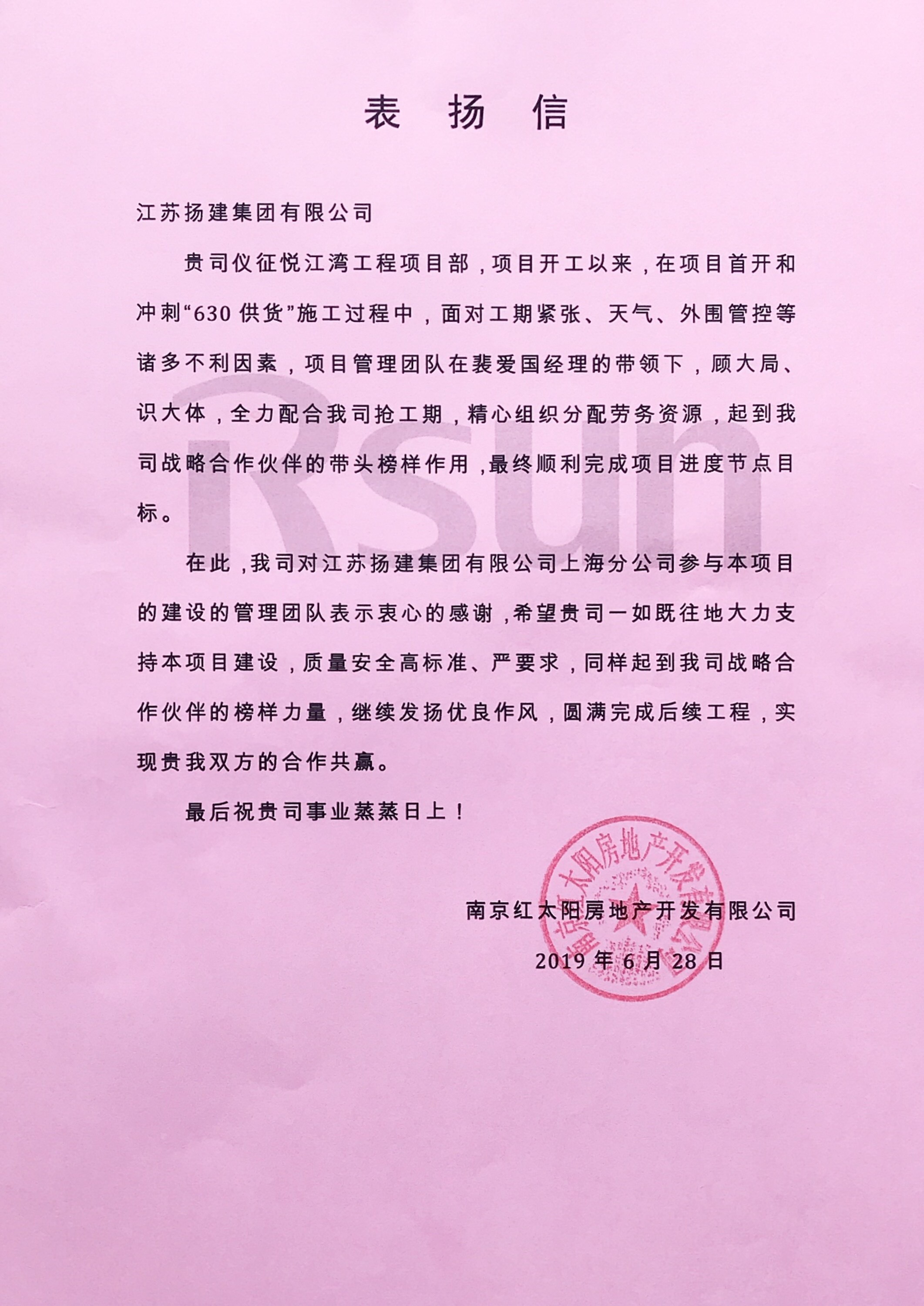四公司儀征悅江灣項目部受到業(yè)主表揚