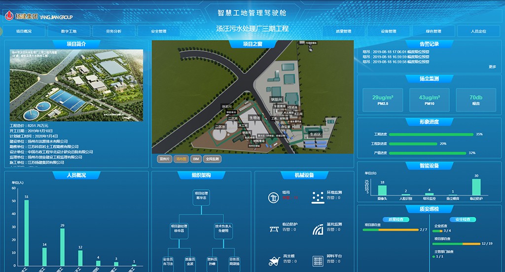 揚建集團以“綠色化”為發(fā)展理念、“工業(yè)化”為發(fā)展方式、“信息化”為發(fā)展手段,將綠色發(fā)展、智慧理念在建筑工地施工中進行試點應(yīng)用,通過智慧工地綜合管理平臺將移動互聯(lián)網(wǎng)、物聯(lián)網(wǎng)、云計算、大數(shù)據(jù)、AI人工智能等新一代互聯(lián)網(wǎng)及物聯(lián)網(wǎng)技術(shù)融合應(yīng)用。項目經(jīng)理蔣畢忠詳細講解了湯汪污水處理廠三期工程目前智慧工地進展情況,強調(diào)項目綠色智慧示范工程重點圍繞現(xiàn)場施工實際過程,建立了互聯(lián)協(xié)同、智慧安監(jiān)、科學(xué)管理的施工項目信息化生態(tài)圈,為政府監(jiān)管、集團管控、項目自檢提供了三位一體的管理模式。通過物聯(lián)網(wǎng)采集到的現(xiàn)場感知信息進行數(shù)據(jù)挖掘分析,對項目施工進行全過程預(yù)警、處置和溯源,實現(xiàn)工程施工安全第一、環(huán)境友好的綠色智慧化管理。