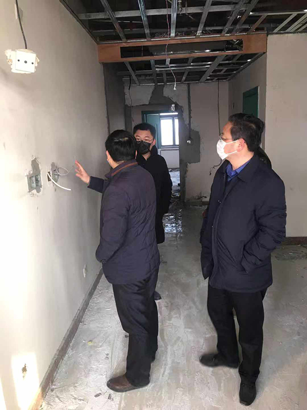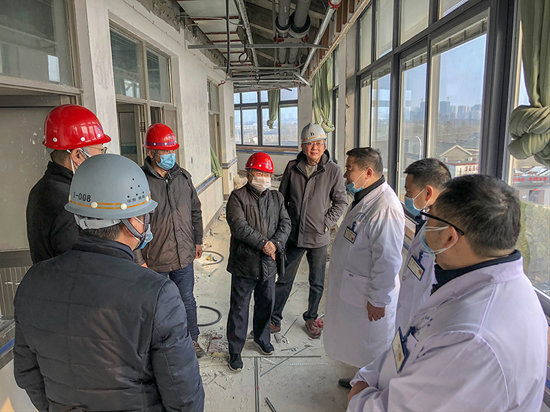 1月27日(正月初三)下午,揚州市市長張寶娟來到市三院,現場調研新型冠狀病毒感染的肺炎疫情防控工作;市衛健委主任趙國祥、建工控股董事長王宏、揚建集團總經理鄒厚存等相關領導陪同,并匯報了關于新建100間箱式板房工程施工方案和進度計劃。由于時間急如星火,為確保及時投入使用,經揚州市委最終決定,取消原100間板房的建設計劃,改為將原醫院4#樓改造為治療醫生和護士的隔離生活區。該病房改造項目為5層,總面積約6000㎡,1~3層要求正月十五完成,4層要求正月二十結束。具體由揚建集團華發公司負責設計并牽頭施工。華發公司設計經理薛愛遐參與制定了設計方案。