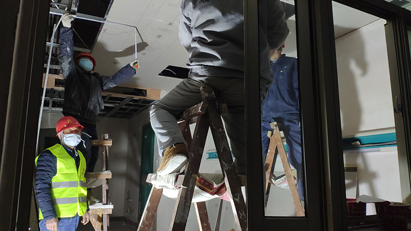 正月初五,正當大家自我隔離閉門不出的時候,華發建設者們放棄了與家人團聚的時光,無懼個人安危,勇赴一線,開啟了一場爭分奪秒的疫情防控施工的硬核戰。早上七點多操作工、木工、油漆工、水電工各自領到了作業面,華發20多名管理人員、64名施工人員,迅速投入到緊張的施工中。初六開始,現場施工人員多達200余人,他們晚上加班加點施工,爭取盡早完成項目。