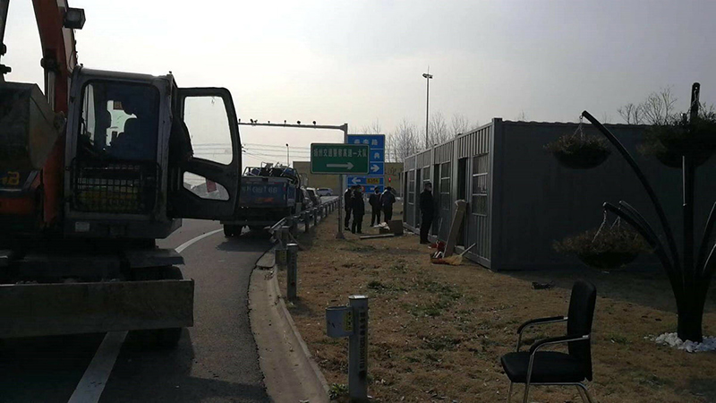 又訊:正月初五下晚,揚州生態新城領導找到我集團一公司,要求我方安排四個集裝箱到滬陜高速G40杭集出口,放在醫務人員測溫檢查房旁邊,用于隔離異常人員。箱子要放在綠化帶斜坡上,需要拆除隔離帶,做一條通道,把挖機開進去,平整好之后放上去;并把箱子用油漆外圍出新,里面打掃好,做相應改造,接上水電、洗手池,放上桌椅、油汀、水壺水瓶。