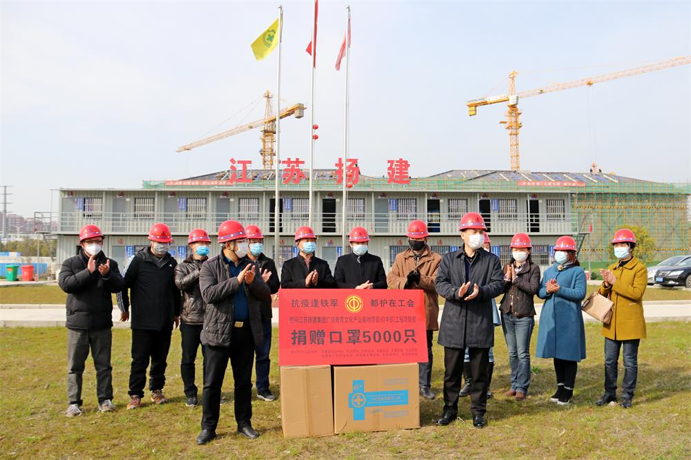 3月11日下午,揚州市總工會副主席韓士軍、建設工會主任范華及建管單位相關負責人,來到我集團承建的廣陵教育文化產業基地項目(初中部)工程項目部,在集團人力資源部、工會的陪同下,向項目部捐贈了口罩,并對企業的復工復產作了指導。