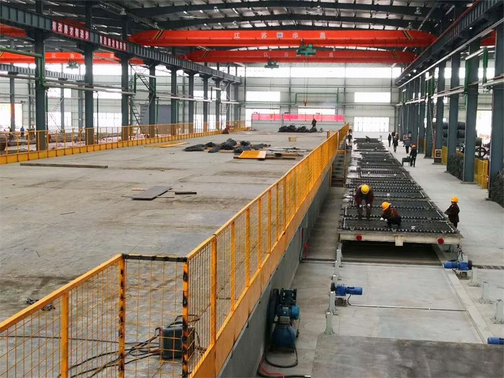 當前,利好的產業(yè)形勢、逐增的業(yè)務訂單、多樣的構件種類,對華晟公司的生產提出了新的要求。本著“改進工藝、釋放產能”的目的,華晟公司經理室超前謀劃,從產能、工藝流程、模臺周轉率、車間現(xiàn)有場地條件等方面綜合考慮,確定了第三跨固定模臺車間改造為自動化生產線和固定模臺生產線相結合的“隧道窯立體綜合生產線”。該生產線建成后,在各類構件生產、產能輸出、模臺利用率、養(yǎng)護窯效能、設備造價上具有明顯的優(yōu)勢。