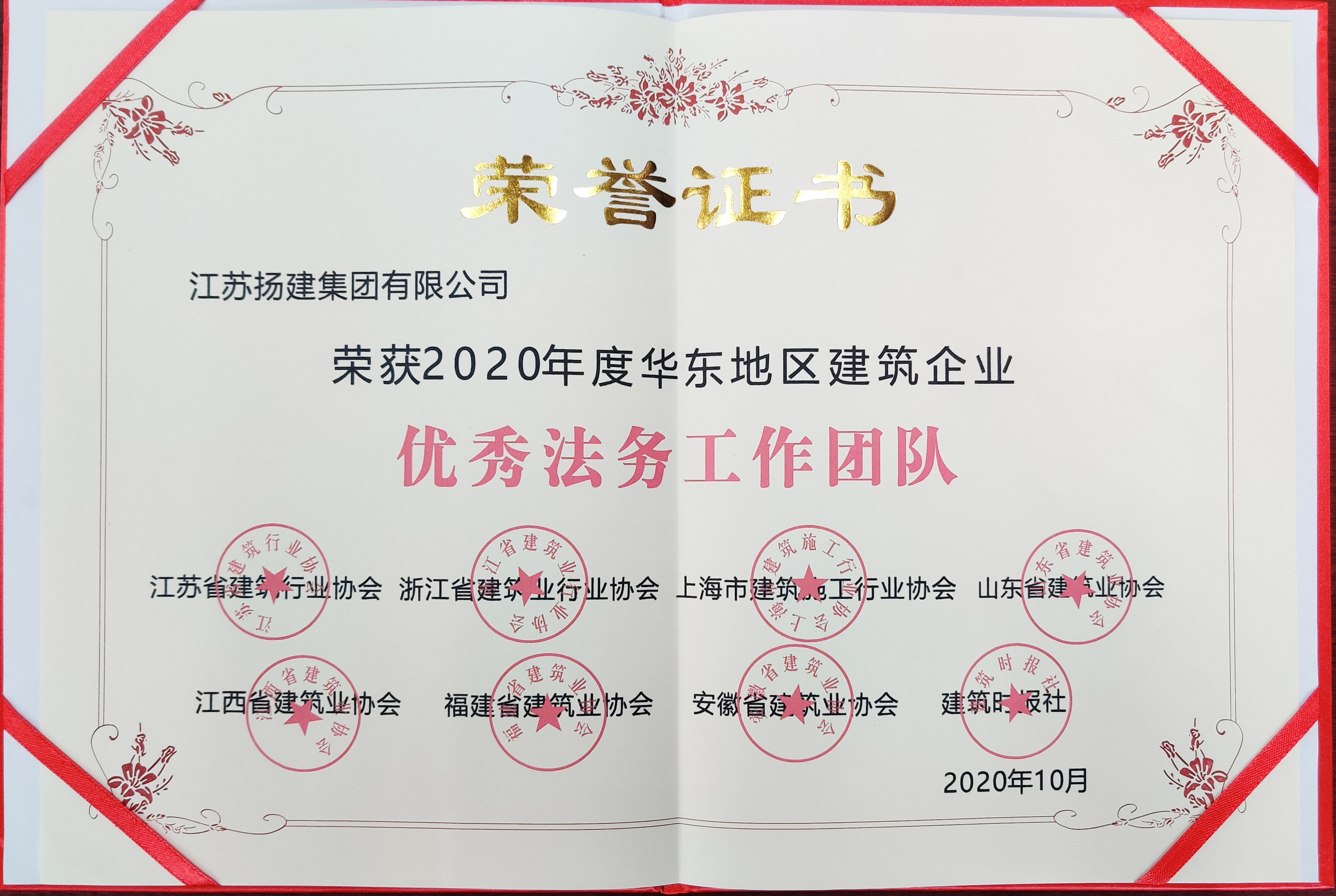 揚建網訊 10月24日上午,第五屆華東地區建筑企業法務工作經驗交流會在蘇州相城區如期舉行。會議還開展了建筑企業優秀法務工作團隊、個人的表彰及頒獎活動,我集團法務部被組委會選評為“法務工作優秀團隊”。