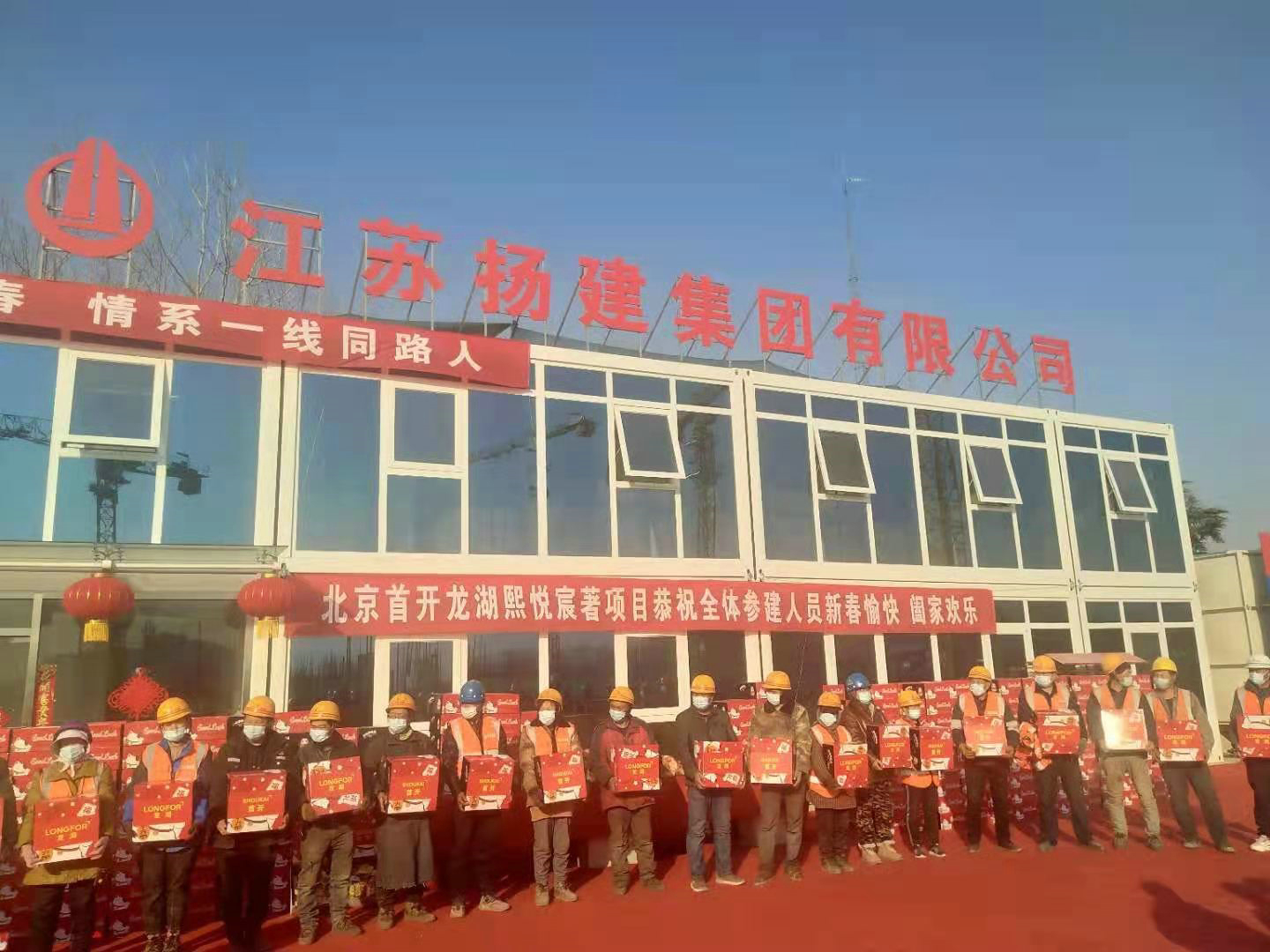 揚建網訊 2月9日上午10時許,北京熙悅宸著項目業主龍湖地產集團北京公司常務副總經理陳明偉、副總經理張長明、首開地產北京公司副總經理李捷等一行冒著嚴寒、風塵仆仆來到項目現場,親切看望和慰問就地過年的農民工和項目管理人員,向奮戰在一線的400多名揚建建設者致以誠摯問候和新春祝福,帶去了滿滿的春節“年貨”。集團北方公司總經理許世明、副總經理吳勇陪同慰問項目全體員工,并檢查項目部春節前各項工作。