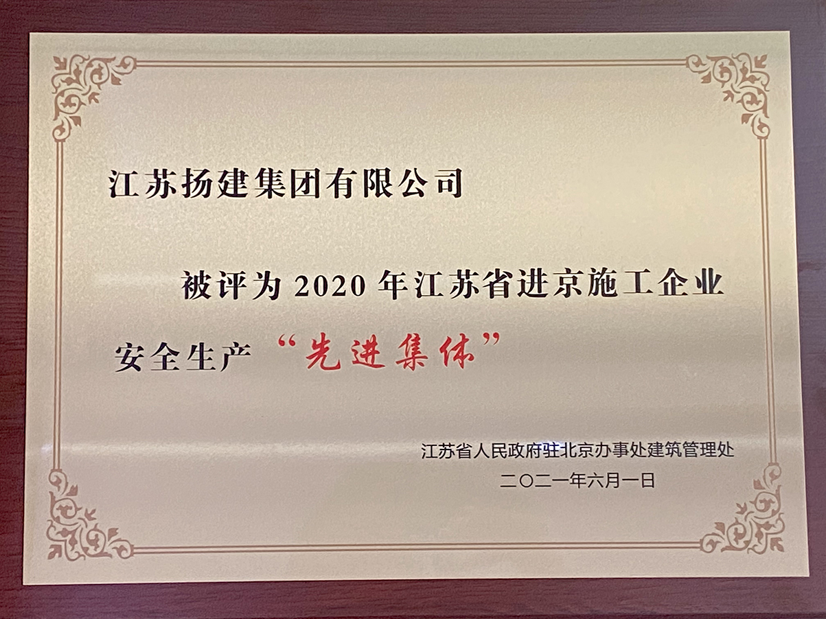 6月9日,江蘇省人民政府駐北京辦事處建筑管理處授予江蘇揚建集團有限公司2020年江蘇省進京施工企業安全生產“先進集體”稱號。