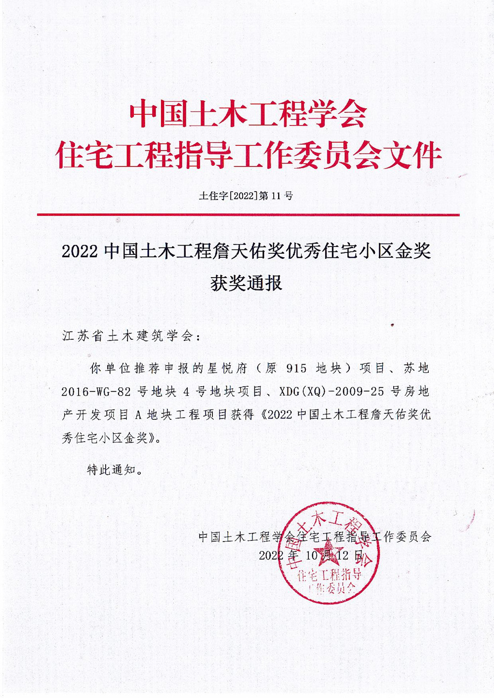 揚建網(wǎng)訊 近日,中國土木工程學會住宅工程指導工作委員會揭曉了“2022年中國土木工程詹天佑獎優(yōu)秀住宅小區(qū)金獎入選工程”名單,集團公司承建的星悅府(原915地塊)住宅項目在眾多項目中突出重圍,斬獲金獎。