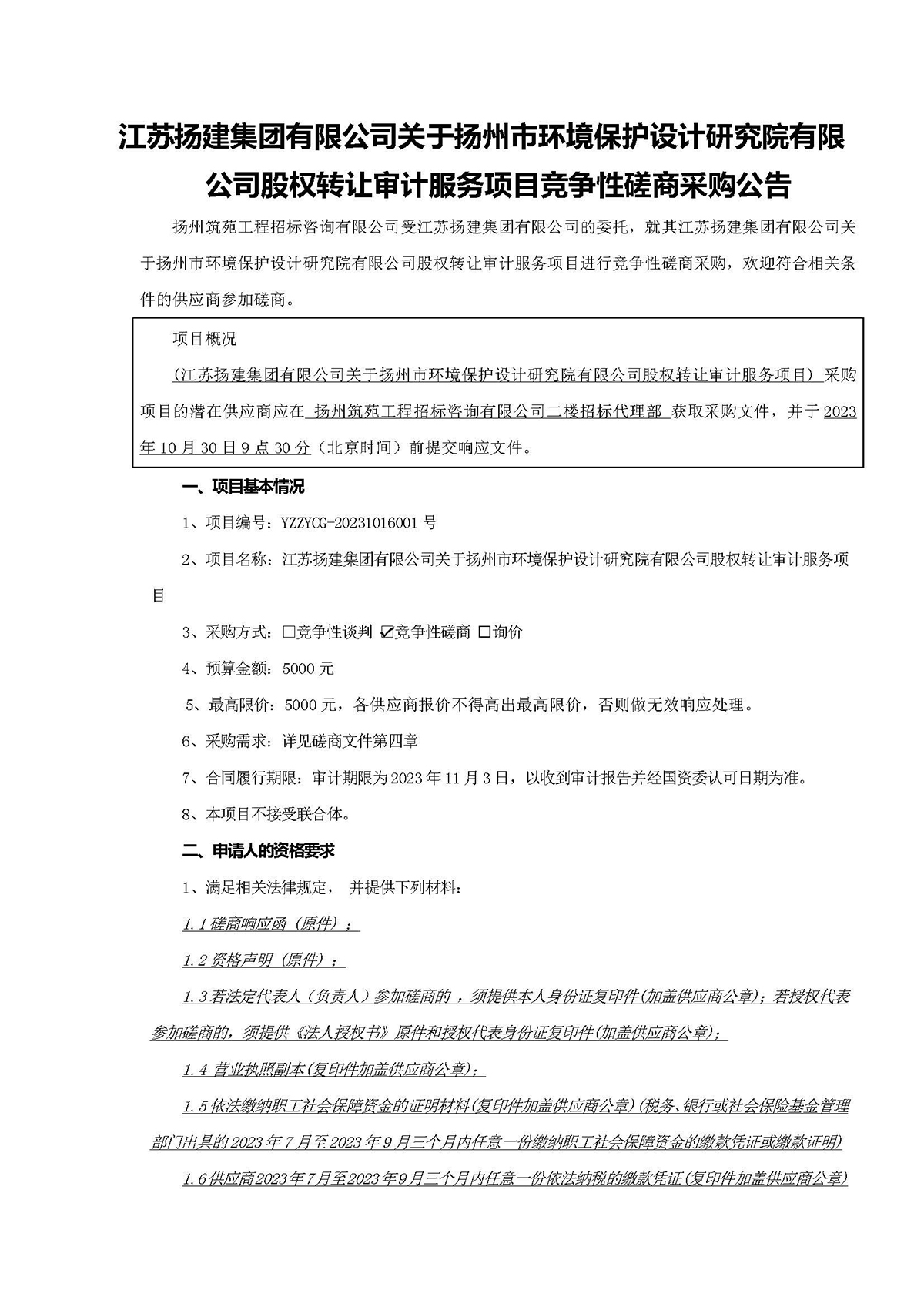 江蘇揚建集團有限公司關于揚州市環境保護設計研究院有限公司股權轉讓審計服務項目競爭性磋商采購公告
