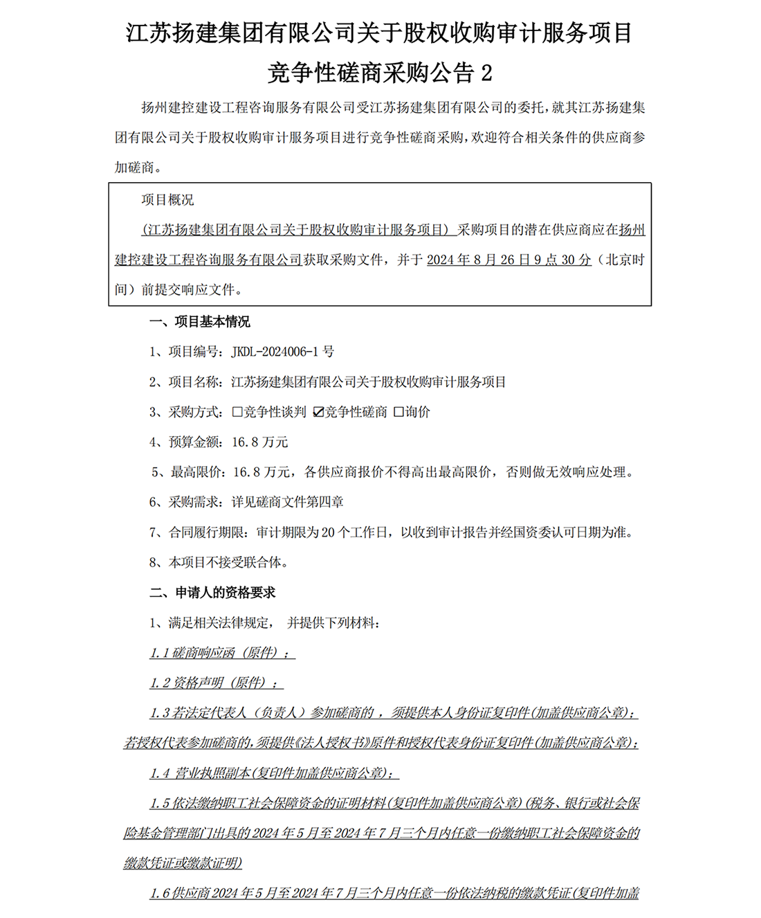 江蘇揚建集團有限公司關于股權收購審計服務項目競爭性磋商采購公告2