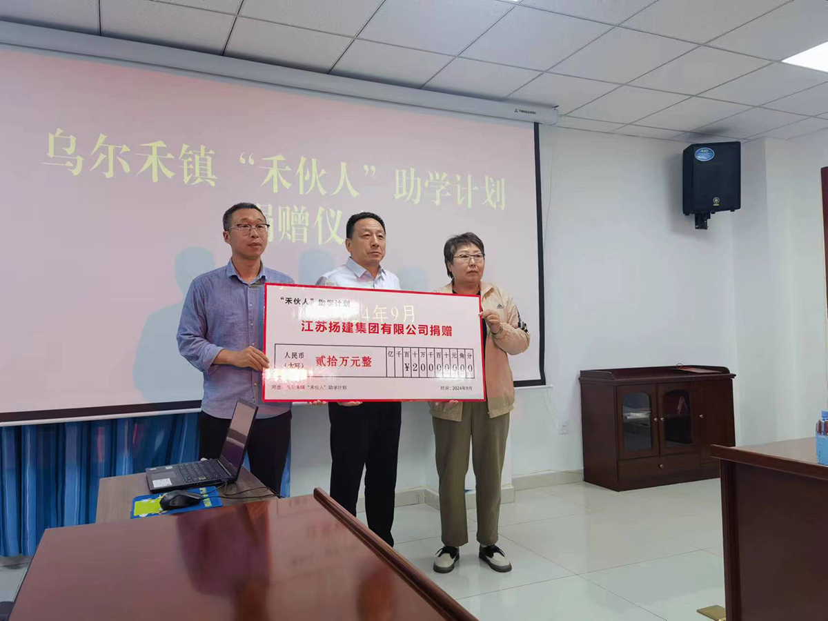 揚建網訊 9月13日下午,新疆烏爾禾鎮“禾伙人”助學計劃捐贈儀式在烏爾禾鎮政府三樓會議室隆重舉行。江蘇揚建集團有限公司副總經理、工會主席劉海斌同志代表揚建集團應邀出席、揚建集團新疆分公司相關負責同志共同參加。